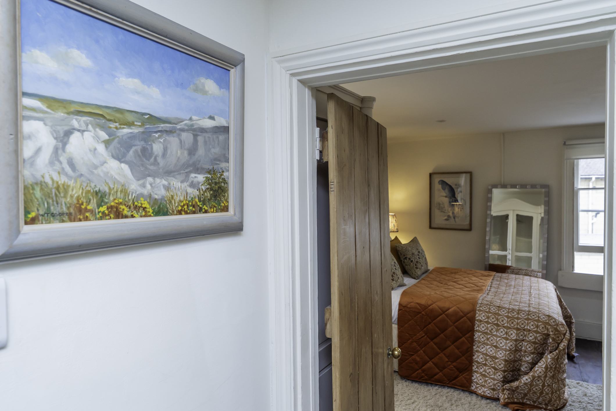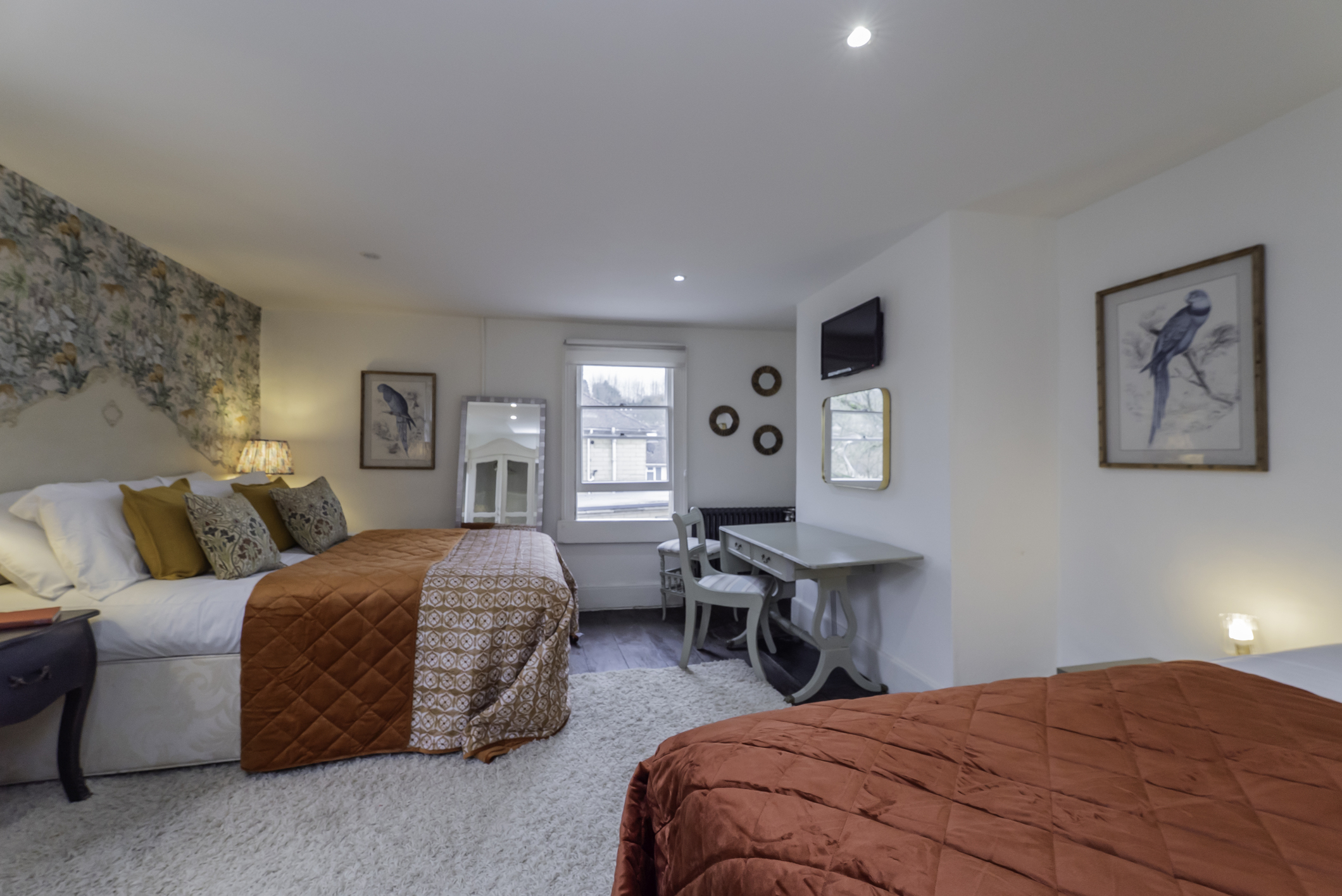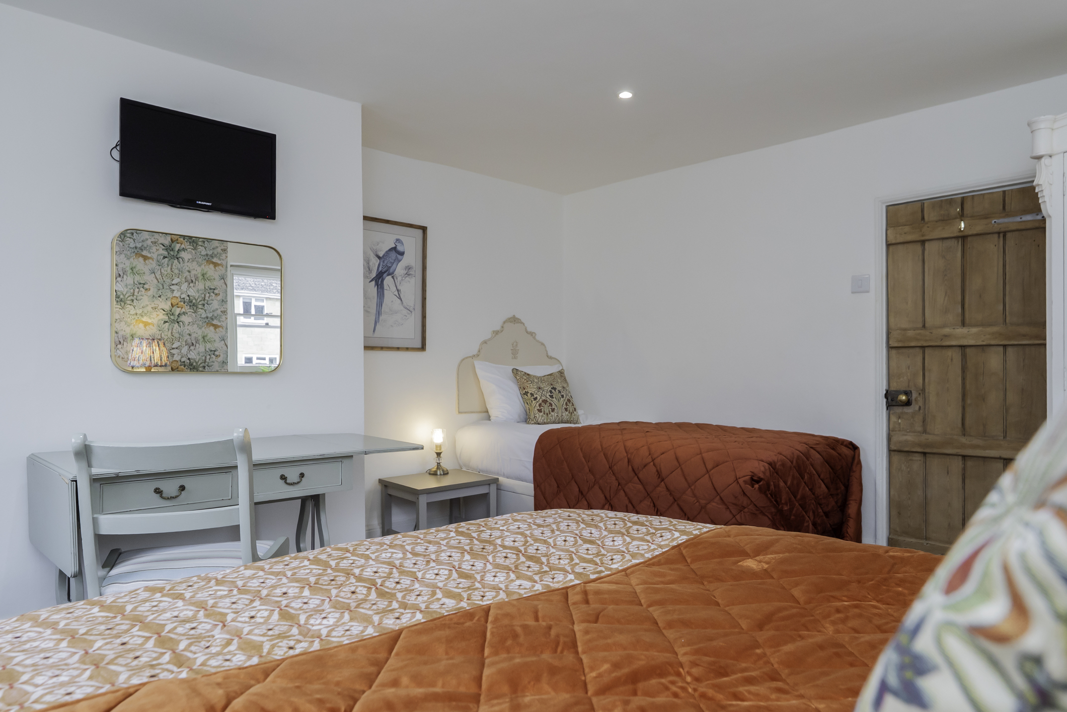 Located in the main townhouse, this flexible bedroom includes one double bed and one single bed, making it well suited to friends sharing, small families, or mixed group arrangements.