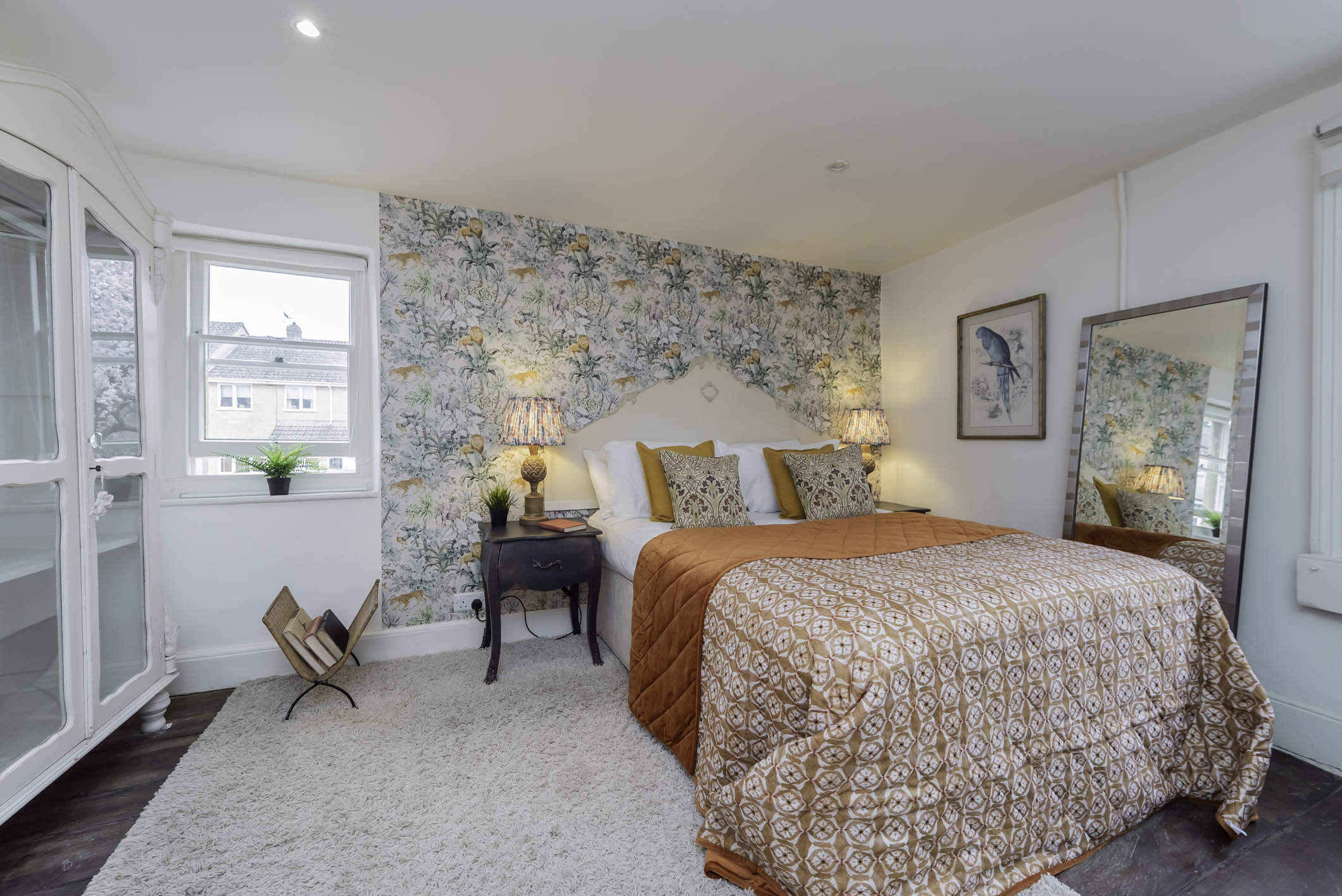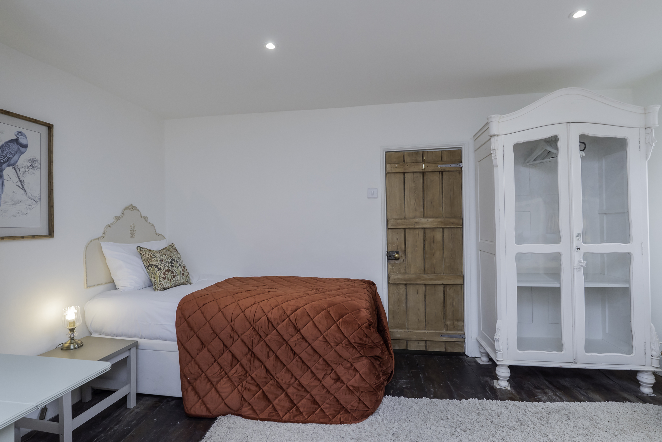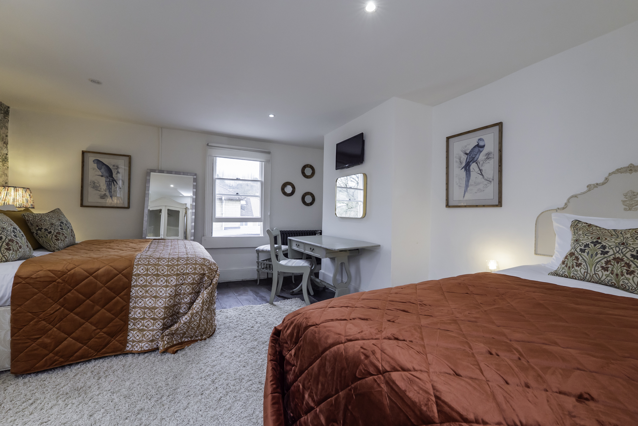 Located in the main townhouse, this flexible bedroom includes one double bed and one single bed, making it well suited to friends sharing, small families, or mixed group arrangements.